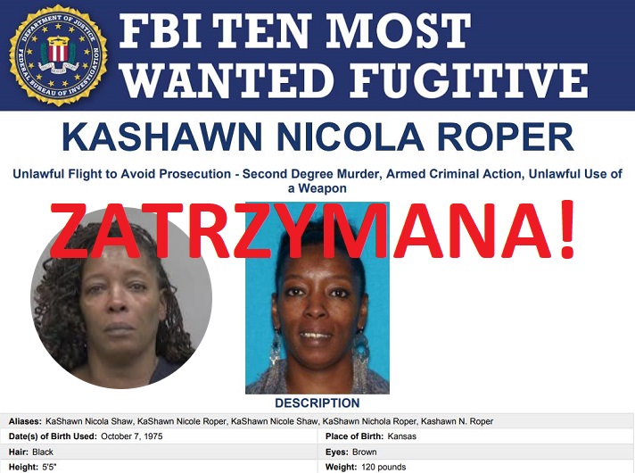 Zaledwie dzień po umieszczeniu na liście „Ten Most Wanted” (dziesięciu najbardziej poszukiwanych osób) i wyznaczeniu nagrody w wysokości 1 miliona dolarów FBI zatrzymało KaShawn Nicolę Roper. 50-latka była poszukiwana w związku ze strzelaniną z 2020 roku w Kansas City. Roper została zatrzymana na Florydzie.